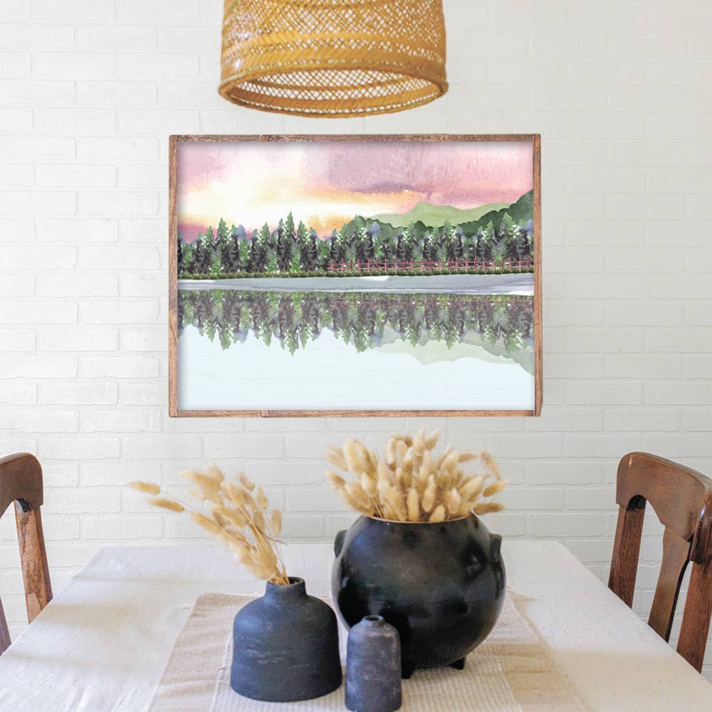 Transform your space into a breathtaking escape with this mountain range landscape art print painting. The majestic mountain, adorned with a pristine blanket of snow, takes center stage, creating a focal point of tranquility. Tall pine trees line the sides, and rocky outposts add a touch of rugged elegance. • Printed with high resolution giclee inks • Fine art canvas mounted on wood • Solid hardwood frame in shown stain colors • Sustainable American alder wood • Made in the USA in our Utah studio • Mini 6x10" x 1.25" deep w/ 1/4 thick frame • 12x18" x 1.5" deep w/ 3/4" thick frame • 18x24" x 1.5" deep w/ 3/4" thick frame • 20x30" x 1.5" deep w/ 3/4" thick frame • 24x36" x 1.5" deep w/ 3/4" thick frame • Signs may have +/-1" variations • Signs can stand on a shelf or table or can hang on the wall from the back edge of the frame • Farmhouse style frames have rustic imperfections that make them unique