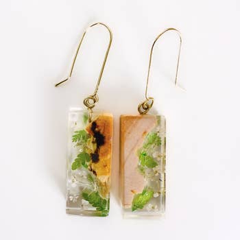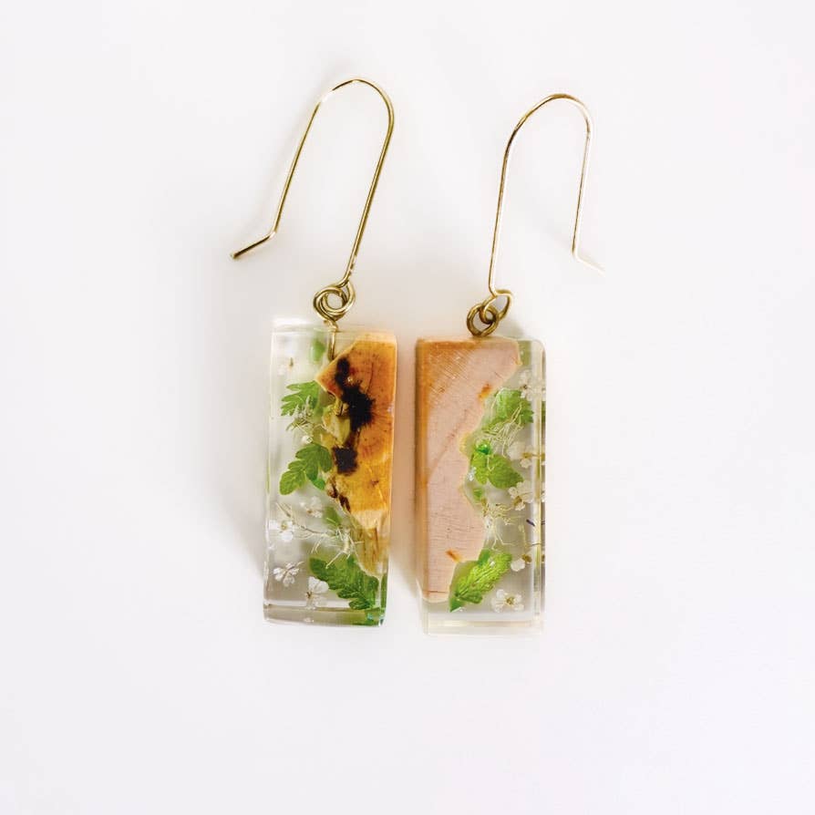 Tufts of wispy green usnea lichen from north Carolina encased in polished resin. Lengths and designs vary. About 1" - 1.5" long. Sterling sliver ear hooks. Usnea lichen from NC, resin, wood, silver. Avg. Size 1.5”x 0.5”.