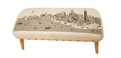 Embroidered city skyline on Ottoman. Overall 17'' H x 38'' W x 16'' D Legs 8.25'' H Overall Product Weight 15 lb. Bench height without the legs: 8.75” Main Material Upholstered Wool Weight Capacity 150 Pounds Leg material Rubberwood nat