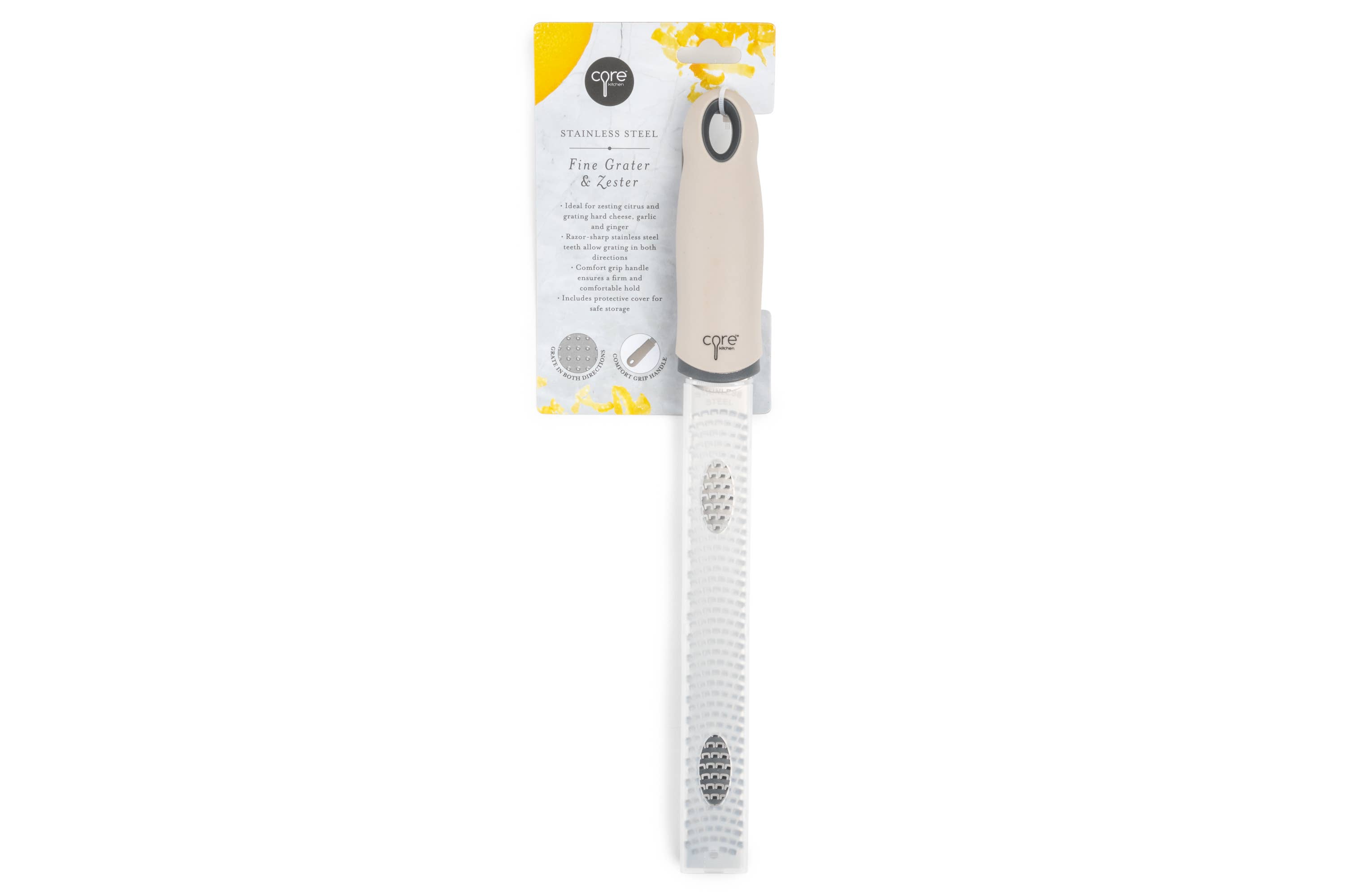 The 2-in-1 Citrus Zester; Reamer features dual-grater technology for maximum zesting while avoiding the bitter pith. It opens to fit various citrus sizes, and the twisting motion allows for precise zesting. The built-in reamer makes juicing effortless, helping you extract every drop. Made from durable, BPA-free plastic and stainless steel, this compact tool is big enough for the job yet easy to store!