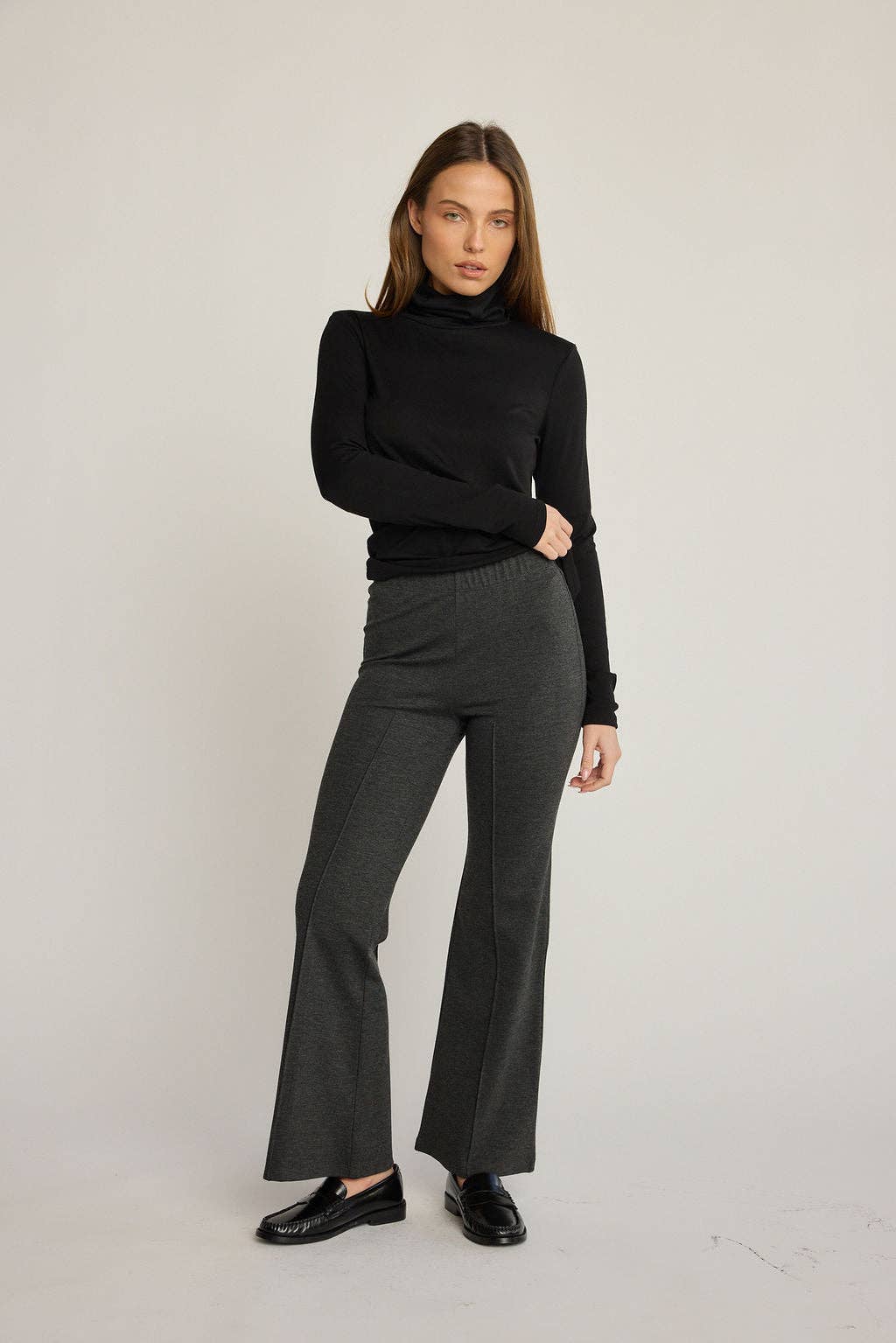 Made in Los Angeles Details: * Turtleneck * Ruched detail * High slit * Stretch rib fabric * Extra long sleeve * Can be dressed up or down Sizing: Runs true to size. Liberty is wearing an extra small and Tiffany is in a small. Model measurements: Liberty: Height: 5'7" Bust: 32C Waist: 23.5" Hips: 35 Tiffany: Height: 5'8" Bust: 34B Waist: 26" Hips: 37 Dress size guide: 0-2 extra small 4 small 6-8 medium 10 large 12-14 extra large. Content: 65% Polyester 26% Rayon 9% Spandex Care Instructions: Machine wash on gentle cycle. Lay flat to dry.