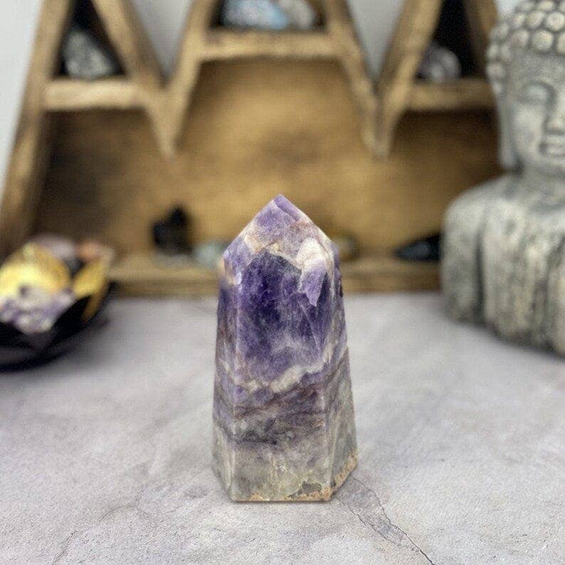 Presenting the Oceanic Linkways Inc's Obelisk - a beautiful Amethyst Chevron stone, standing 7-10" tall. As a prominent wholesaler of spiritual gifts and home decor, we pride ourselves on sourcing high-quality gemstones from 19 countries. This spiritual stone, with its captivating patterns, can elevate the ambiance of any space, making it a must-have for your wellness routine. Explore more at www.oceaniclink.com.