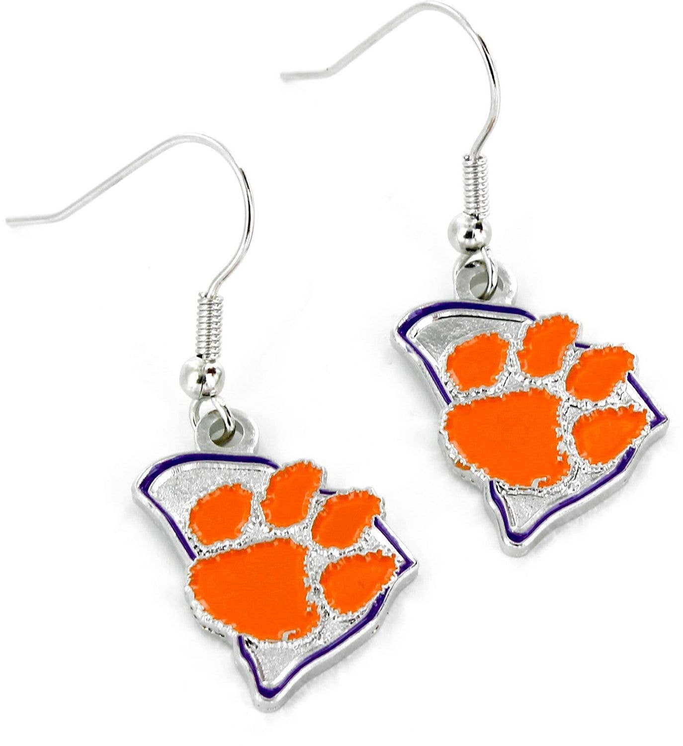Silver plated shepherd hook earrings with an orange and clear crystal loop and a silver dangle Clemson logo charm. This is an officially licensed product.
