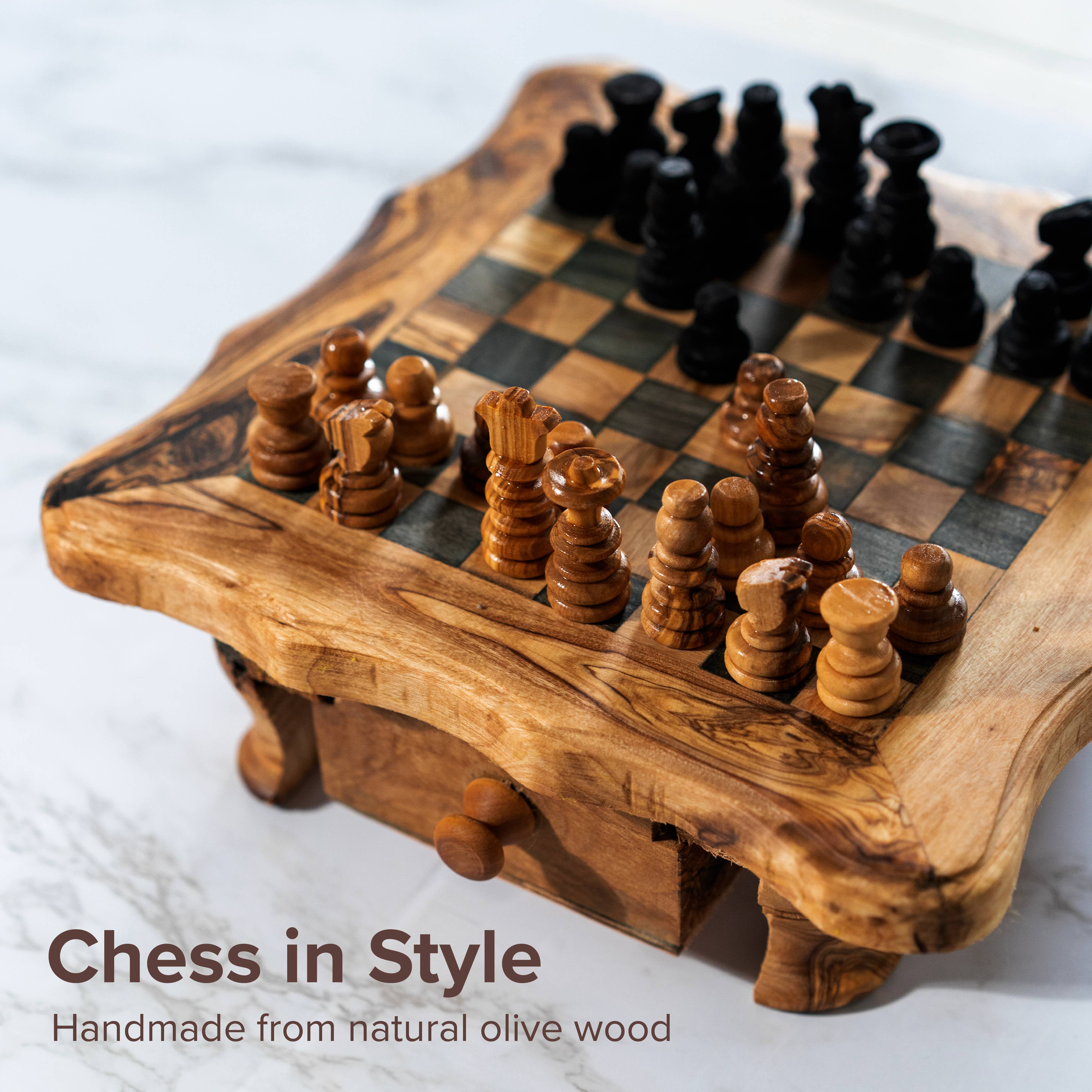 This Handmade Rustic Chess board is made of Tunisian olive wood. It is a beautiful and entertaining piece to have at home or offer as a gift. This model of chess set is wonderful not only to play but as a classy piece of home décor as well. 🔍Available Dimensions: ❖ The full board Square : 1- 28cm x 28cm (11 Inch x 11 Inch) ±10% 2- 33cm x 33cm (13 Inch x 13 Inch) ±10% 3- 40cm x 40cm (15.7 Inch x 15.7 Inch) ±10% 4- 47cm x 47cm (18.5 Inch x 18.5 Inch) ±10% 💡 KEY INFORMATION ❖ Brand: HappyWoods® (registered trademark). ❖ Handmade in Tunisia ❖ Each piece is hand carved by skilled artisans from natural olive wood.. ❖ Material: Tunisian Olive Wood, derived from Chemlali olive trees variety (darker than other varieties) . ❖Wood Characteristics: Very hard and strong. Olive Wood is durable and moisture-resistant hardwood. Will last you a lifetime! ❖ Colour: Deep brown with strong oil-like grain pattern. Naturally darkens with use. As a natural product, color may vary from listing photos.