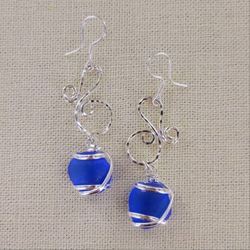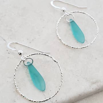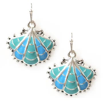 This earring features a stamped metal scallop charm hanging with a “sea glass” bead. The earring has an antique silver plated finish and hangs about 1.75 inches long from a French wire.