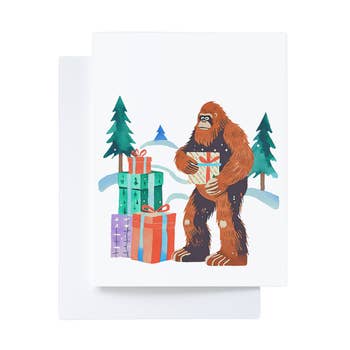 Is it time to open presents Yeti? letterpress holiday card from Letterpress Jess. Size: A2 greeting card (4-1/4" x 5-1/2"). Paper: 110# cotton stock. Front: Is it time to open presents Yeti? Inside: Blank. Envelope: Brown bag kraft envelope (70# stock, 100% post-consumer waste). Packaging:Â Packaged inside a clear cello sleeve. All of our greeting cards are handprinted (one at a time) on vintage midcentury Chandler & Price letterpress printing presses.