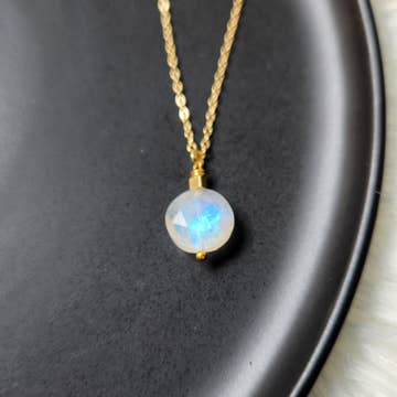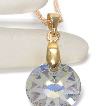 This shade of Swarovski Crystal is absolutely stunning. White opal sky is a unique color that creates a dark blue hue around the edges and gradually lightens towards the center. The 10mm (.40") square cushion Swarovski crystal is meticulously hand-set into a gold-plated setting and hangs from an 18" gold plated chain. This 4-carat crystal pendant is a must-have for adding a touch of brilliance to any outfit, whether it's for a special occasion or everyday wear. Ships Free • Handmade in the USA