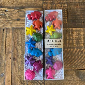 Ocean creature shaped colored crayons packaged in a plastic-free Kraft box, 4.625" x 3.5" x .25".