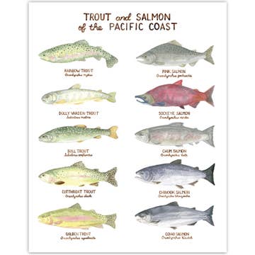 This 11 x 14 fish art print features watercolor illustrations of native trout and salmon found in the Pacific Northwest. Each fish illustration is paired with its common and Latin name. Museum quality art print created with fade resistant 19pt Savoy Cotton archival paper and ink. Packaged in a plant-based commercially compostable cello sleeve with sturdy recycled backing board.