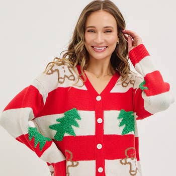 Tan button up cardigan Red bow design on the front & back 100% Acrylic Pre-pack 2-2-2-2 (S-XL) Min. Qty. 8