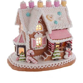 • SKU: DK5715 • Description: 6" Glittery White and Pink Resin Gingerbread House Warm White LED Display with Snowcapped Chimney • IMPORTED • Product Dimensions: 6 x 6 x 3.75 Inches; 0.92 lbs