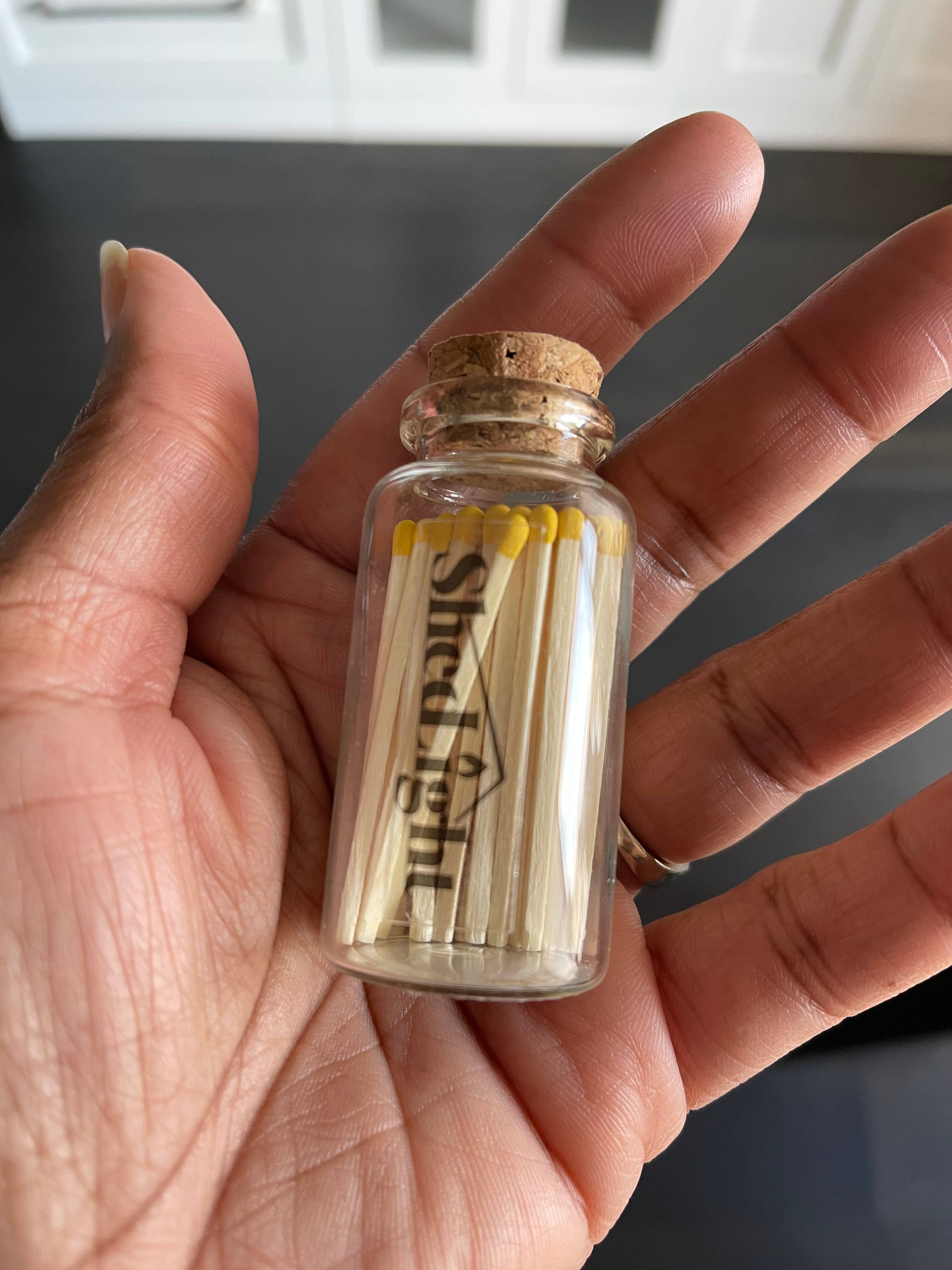 Glass match box with rainbow colored matches. May order solid colors. Cute Custom Party Favor comes with a striker pad at the bottom of the glass jar. Matches are strong and easily strike on the pad. 2 inch matches, qty of 30 per jar. Customizable upon order with minimum quantity. Perfect for gifts and party favors. Handmade matches, crafted in the USA. 10% of proceeds donated to foster youth in Colorado, Adams County.