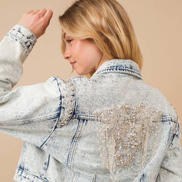 A DENIM JACKET WITH RHINSETONE FRINGE AND NASHVILLE ON THE BACK WITH DECORATIVE WINGS