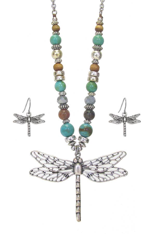 FR2910 Antique Silver Abalone Dragonfly Necklace Set