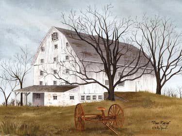 BJ1037-405 "Autumn Gold" by artist Billy Jacobs, in a stylish 19" x 15" black frame. This art features a farm scene in the fall of the year, with 3 crows sitting on a barb wire fence in the foreground. The largest of several red barns has a rusty metal roof complete with cupola, while a silo towers overhead. This framed art is totally American made. The surface of the art is coated with a fade resistant texture which gives it a canvas-like appearance. No glass is necessary. Arrives ready to hang.