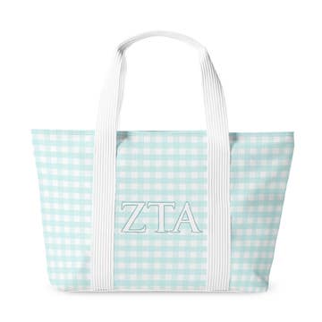 Bags are embroidered with the sorority shown in the color to match the bag. LARGE TOTE FEATURES: ~14"H X 25"W X 9"D ~Zip Closure ~1 Outer Pocket with open top is great for easy access to smaller items. ~18" Canvas handles with a 9" handle drop ~Made of 18oz Canvas with sturdier seams that allow the tote to stand on its own. ~Top Zip Closure MEDIUM TOTE FEATURES: ~12"H X 18"W X 5.5"D ~Zip Closure ~1 Outer Pocket with open top is great for easy access to smaller items. ~18" Canvas handles with a 9" handle drop ~Made of 18oz Canvas with sturdier seams that allow the tote to stand on its own. ~Top Zip Closure SMALL TOTE FEATURES: ~9.5"H X 13.5"W X 5.5"D ~1 Outer Pocket with open top is great for easy access to smaller items. ~5" handle drop ~Made of 18oz Canvas with sturdier seams that allow the tote to stand on its own. ~Open top, NO zipper