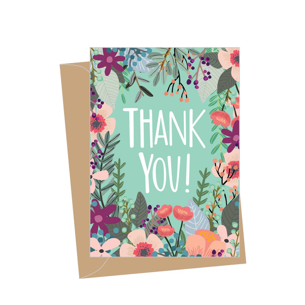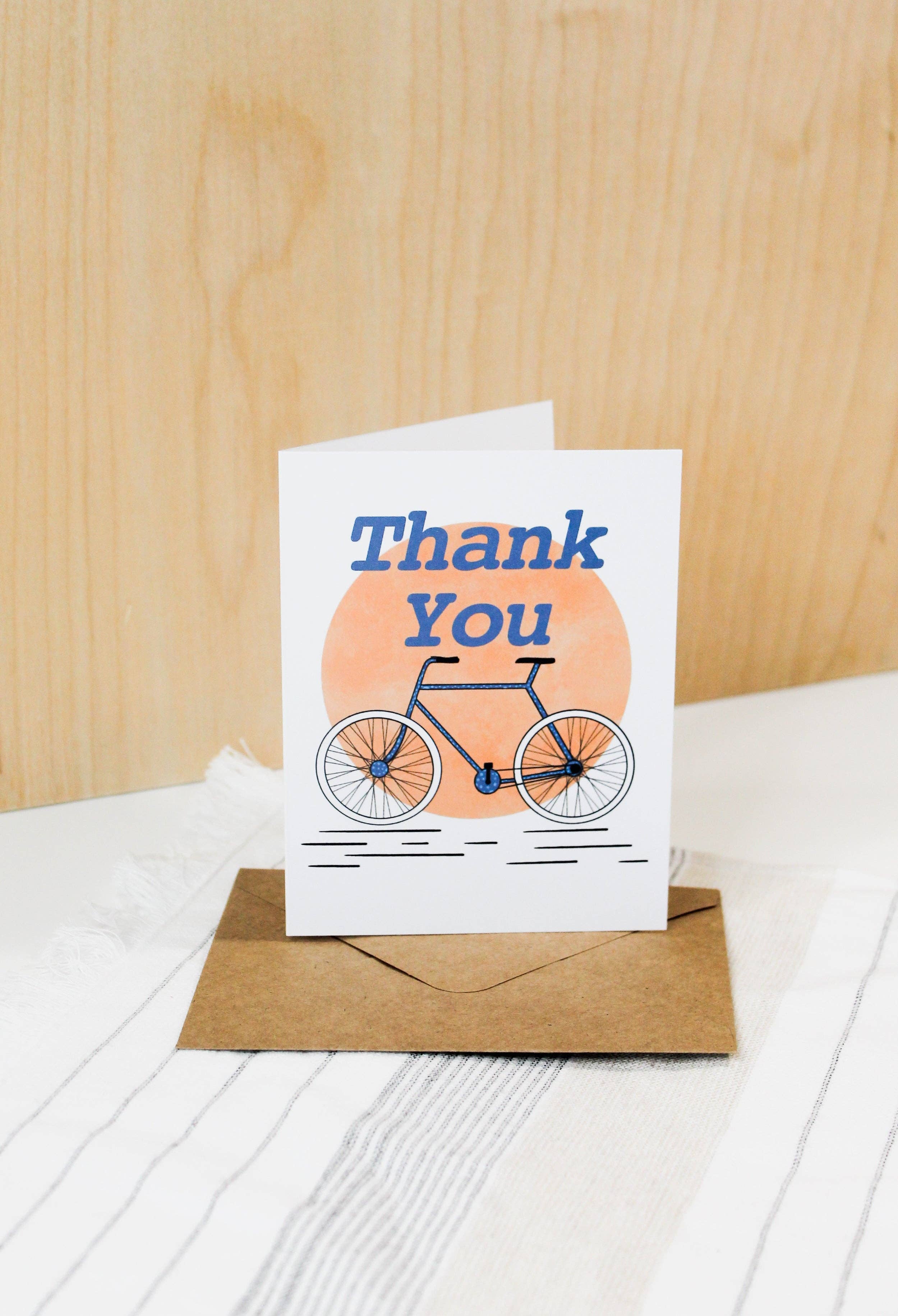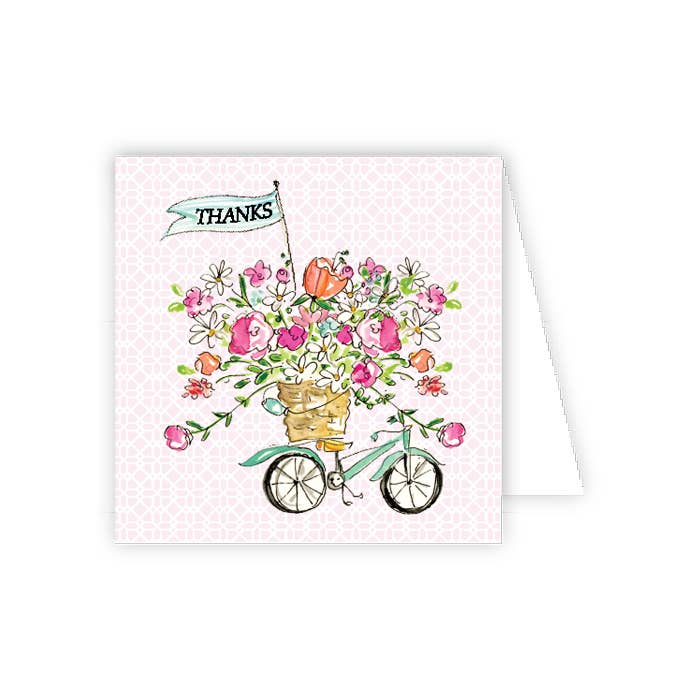 This Thank You Bicycle Banner Card is sure to put a smile on their face! Show some lovin' with this vibrant watercolor bicycle illustration and hand-lettered 'thank you' banner. Baskets of black-eyed-susans provide a cheerful, eye-catching touch. Pedal your thanks in style! Card measures 4.25" x 5.5" (A2) card and is blank inside Includes one Kraft envelope Card and envelope come wrapped in a cellophane sleeve