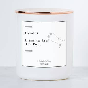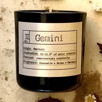 Social, Witty, Honest Introducing our Gemini-inspired candle, a vibrant blend crafted to reflect the dynamic and dual nature of this zodiac sign. Infused with notes of fresh coconut & zesty lime and then balanced with smooth vanilla this candle embodies Gemini's lively & versatile spirit. Let the tropical aroma spark your love for adventure or set the mood for a charming and social night. Whether you're looking to bring some of Gemini's playful energy into your space or just looking for a bright inviting fragrance, this one is for you. This 8 oz. candle comes with a crystal that has been hand selected to amplify the Gemini energy it gives as it's burning. Aries candles with a crystal will include an intuitively selected aquamarine or moonstone. Scent Profile: Top Notes - Bergamot, Tangerine Middle Notes - Coconut, Lime, Palm, Lemon Verbena, Base Notes - Vanilla, Musk, Sandalwood