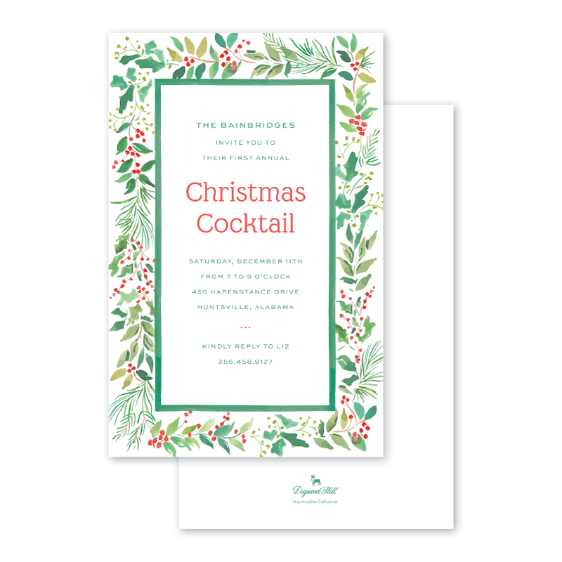 Our Holly Berry invitations are printed and foiled in Memphis, TN. Full color ink printed on natural white paper, letterpress printed in foil, and paired with natural white envelopes. Each invitation is embellished with foil accents with plenty of room for you to write or print all the necessary details. Sold as a Box of 10 invitations with blank envelopes or Bulk of 100 invitations with blank envelopes. Dimensions | 5.5 x 8.5 inches. Quantity | box of 10 or bulk 100
