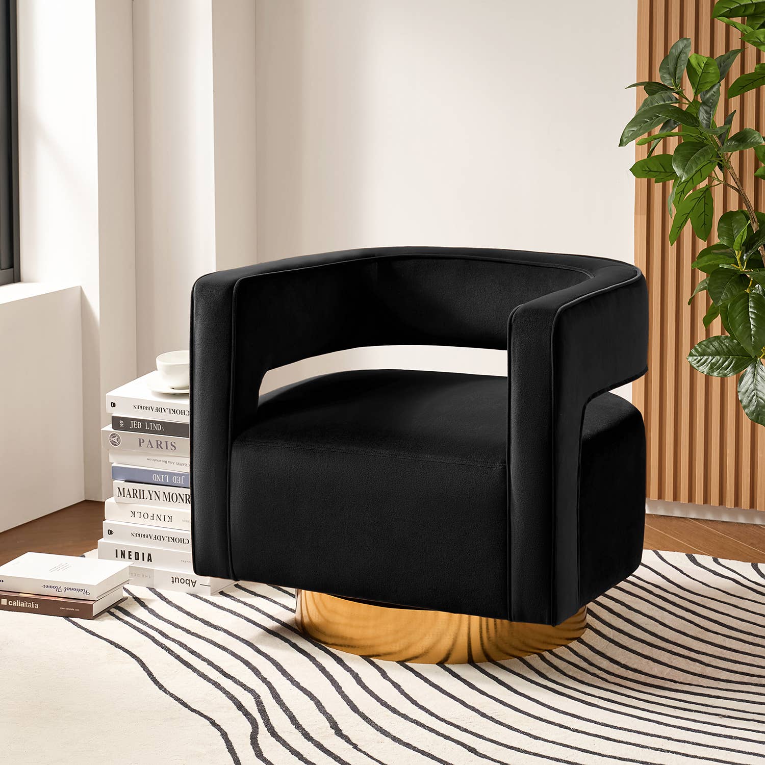 Its curved back and arms, bronze nailhead accents, and rich brown faux leather upholstery make it a luxurious addition to any space. With high-density foam and a sturdy wood frame, it provides exceptional comfort and support. The swivel chair comes fully assembled for hassle-free setup. Overall: 29.5"W x 31.5"D x 28.5"H Seat: 21.5"W x 24"D x 19"H Classic low-back barrel chair design with elegant button tufting on the back and sides 360-degree swivel functionality allows for ease of movement and convenience Front of the chair is accented with nailhead detailing for added visual interest Removable seat cushion for added comfort (not reversible) High-density foam offers superior support and may feel initially firm. Over time, the foam will soften and provide optimal comfort Comes fully assembled, with no additional assembly required