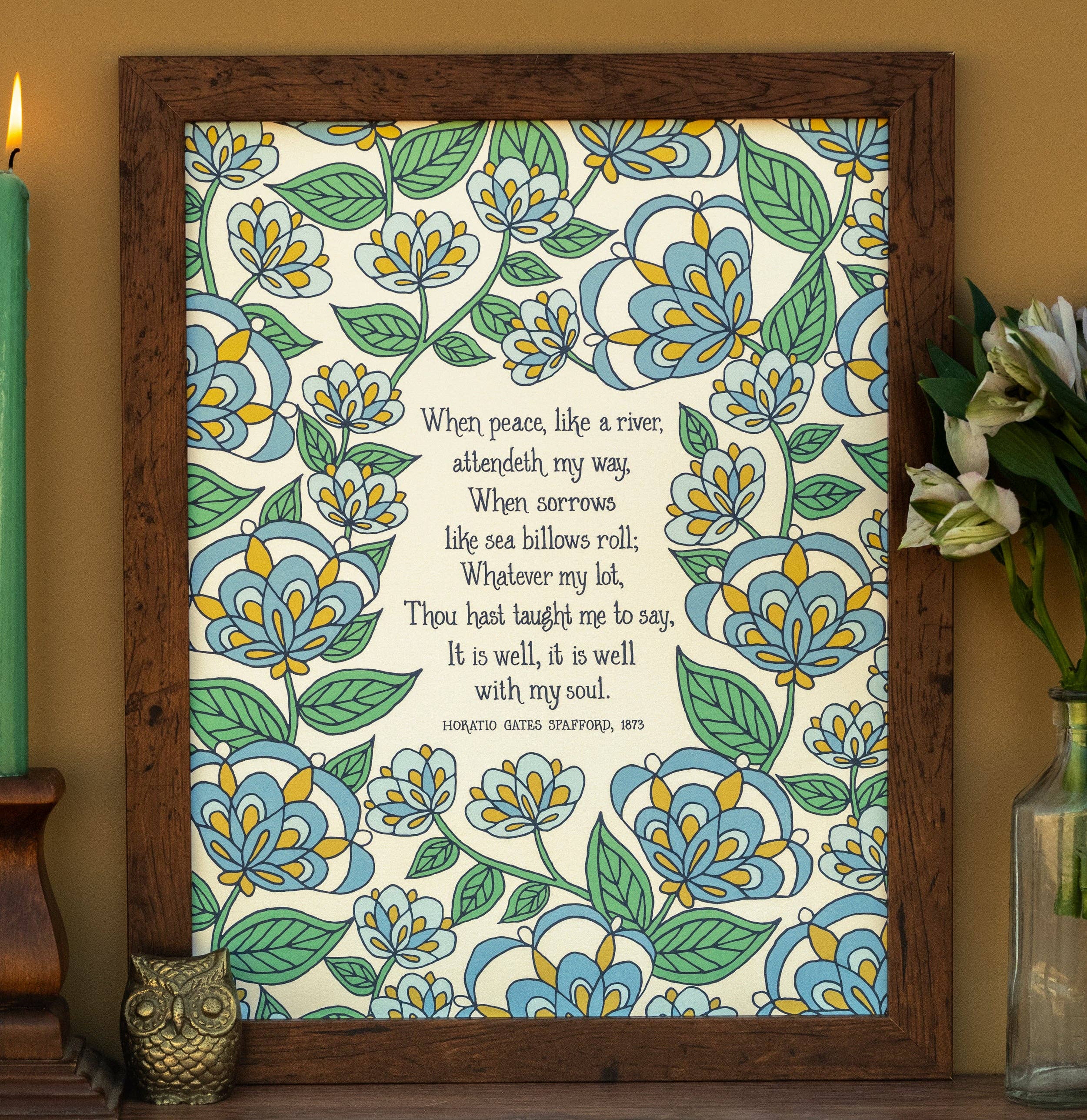 This print features an original watercolor and gouache illustration and the scripture, Philippians 4:8.