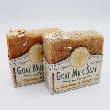 Simple, pure, and soothing, our Milk & Honey contains raw honey, goats milk, and natural oats to create a subtle, warm, inviting aroma. There are no essential oils in this particular goats milk soap bar, the aroma comes straight from the pure honey! Great for sensitive, dry, or irritated skin- this bar has a great lather and should be used on both body and face. Also a great hand soap for the kitchen or bathroom. Great for children with itchy skin, give them a bath and let the oats fall into the tub. 4 oz. bar Ingredients: Saponified organic olive oil, organic coconut oil, organic flaxseed oil, organic shea butter, fresh goats milk, raw Texas honey, organic oats. No palm oil! No synthetics! **MILK AND HONEY NO LONGER HAS OATS ON TOP, updated photos coming soon.