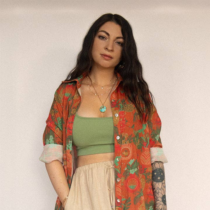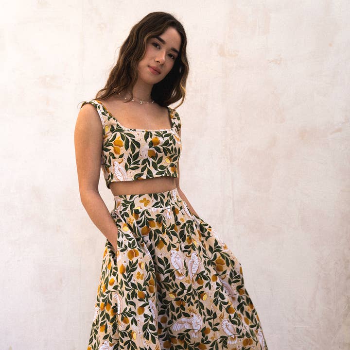 This tropical dress drapes in soft, stretchy fabric that flows like a sea breeze. Designed with a flattering scoop neckline, secret side pockets, and a vibrant print inspired by lush island gardens, it’s the dress you’ll reach for from golden hour strolls to seaside dinners. Slip it on, and let the day unfold like a postcard. - Hidden Pockets - Soft, stretchy fabric (95% cotton 5% spandex) - Made in California - Midi length We are a woman and artist owned business based in California! ☀️
