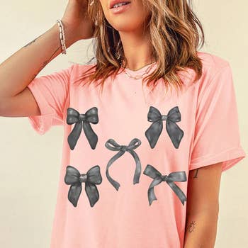 Hey there, boutique owners! Let's talk about a wardrobe essential that's anything but basic: our Pink Bow Wholesale Women's T-shirt, brought to you by Katydid. This isn't your average tee—it's a statement piece designed to add a pop of personality to any outfit. Picture a classic comfort colors graphic tee with a twist: a large pink bow graphic, screen printed to perfection. Designed with both comfort and style in mind, our Pink Bow Wholesale Women's T-shirt is the perfect addition to any wardrobe. So, what are you waiting for? Add a touch of flair to your boutique's collection and make sure your customers are ready to turn heads wherever they go. Grab yours today and be the go-to destination for fashion-forward graphic tees that are making waves on social media! 100% ring spun cotton comfort colors t-shirts designed in the USA garment dyed fabric ribbed collar size up for oversized fit