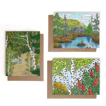A set of notecards featuring a curated selection of Massachusetts scenes, including locations in Essex, Nantucket, Cape Cod, and Plum Island. - Set of 8 A2 folded cards (two of each design) - Paired with 8 kraft envelopes - Printed on 120 lb 100% recycled card stock - Printed in the USA - Plastic-free packaging