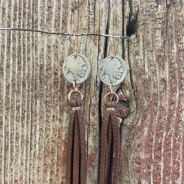 Indian Head Cent & Leather Tassel Earrings - Chocolate Brown