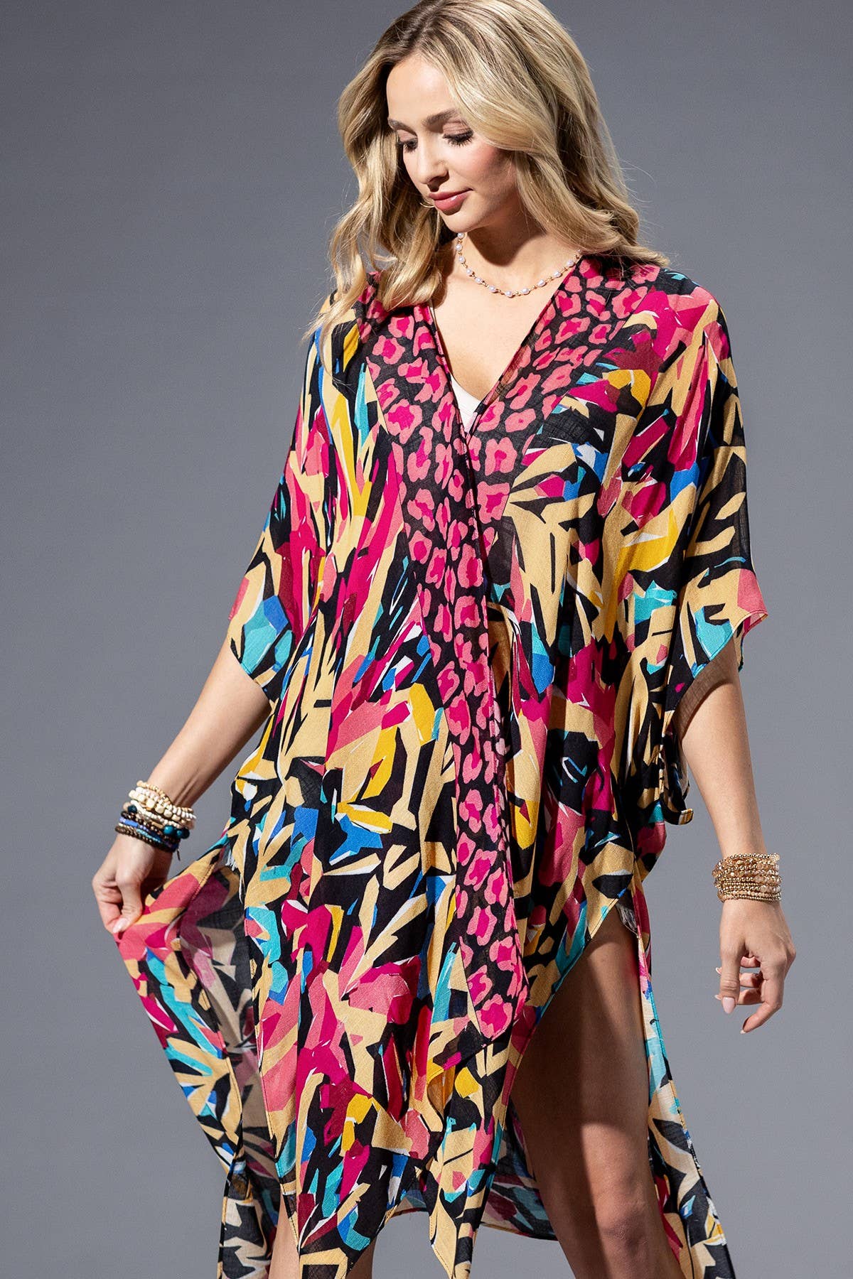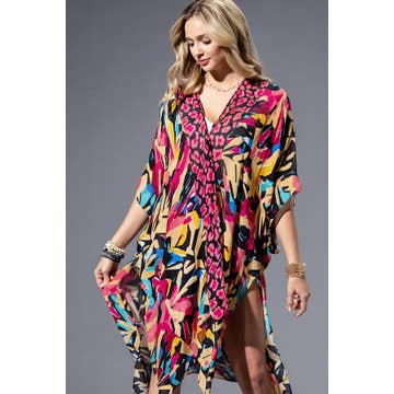 Unleash your inner trendsetter with our geo tie-waist multicolor kaftan. This eye-catching kaftan features a playful keyhole cutout and stunning geometric patterns guaranteeing compliments. The tie waist cinches for a flattering fit, while the lightweight, silky fabric drapes beautifully for effortless comfort, making it perfect for poolside relaxation or summer soirées. "-Material: Viscose Satin -Made In India"