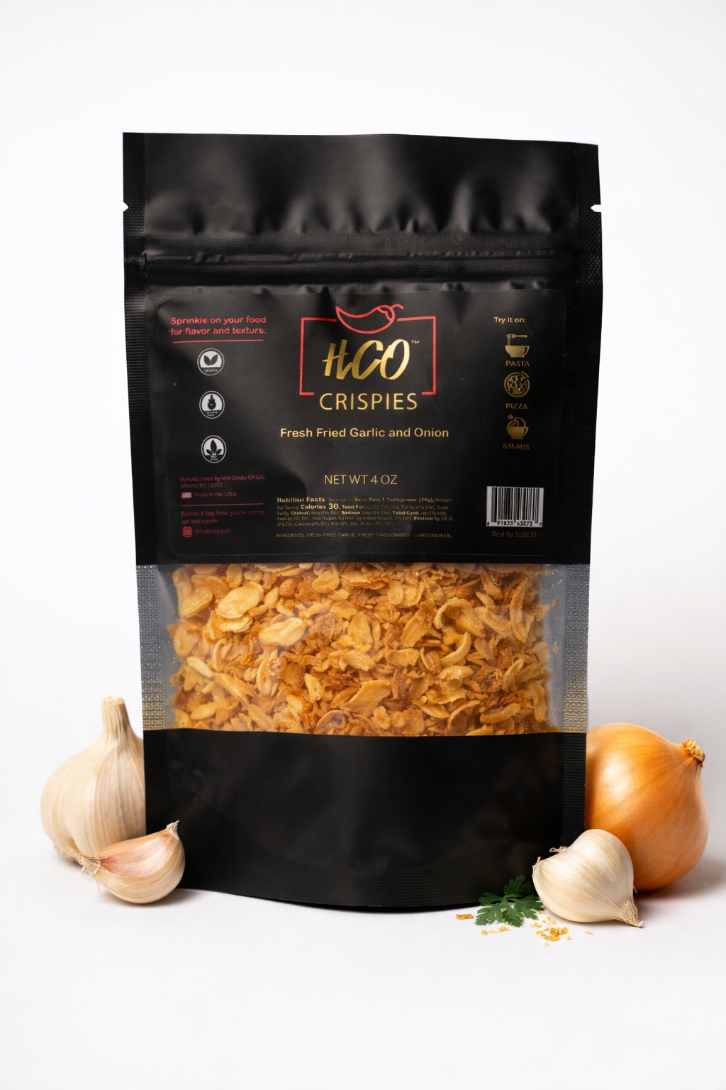 An extra hot version of our original recipe of blended extra virgin olive oil, fresh fried garlic, shallots, and chili peppers makes for the perfect combination of heat and flavor. Hand-crafted in small batch style in the state of New York, this one of a kind product makes a great addition to any fully-equipped commercial or home kitchen. Hot Crispy Oil is great for cooking, dipping, dressings, savory fare and more. We recommend it on pizza, pasta, bread, eggs, salads and much more. Gluten Free, All Natural, Vegan. Makes a great gift as well. Product comes in a sealed 6oz. jar shipped created in our own clean, commercial kitchen in the heart of upstate New York. Care instructions: store in dry cool place.