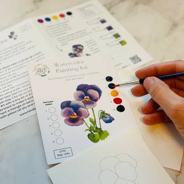 This mini watercolor paint by number of the cool cactus desert is a landscape that is a perfect DIY kit for all artists new and experienced. The design is lightly outlined on the mini canvas and contains a 6x9 instructional card to help you paint your mini masterpiece! You have the option of gently pulling off the bottom of the card, with the paint on it, along the perforated line if you want to gift the finished painting with the letter or you can keep everything intact and gently pull the mini canvas from the card. For all skill levels. Packaged in beautiful box specially made for this kit! The kit contains: Folded Letter with 4 color palette White Envelope 3.5x5” mini canvas with outlined design Watercolor Brush Instructional paint by number sheet with visual of final painting to reference