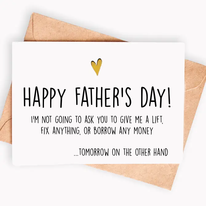 Funny Mother's Day card - Happy Mother's day! When is dinner ready? 5.5 x 4.25 (A2) folded card. A2 100% recycled heavy kraft envelope. Professionally printed on 130# heavy cover stock. Heart shaped cut out on the front, revealing the gold heart sticker on the inside of the card. Blank inside for your own personal message.