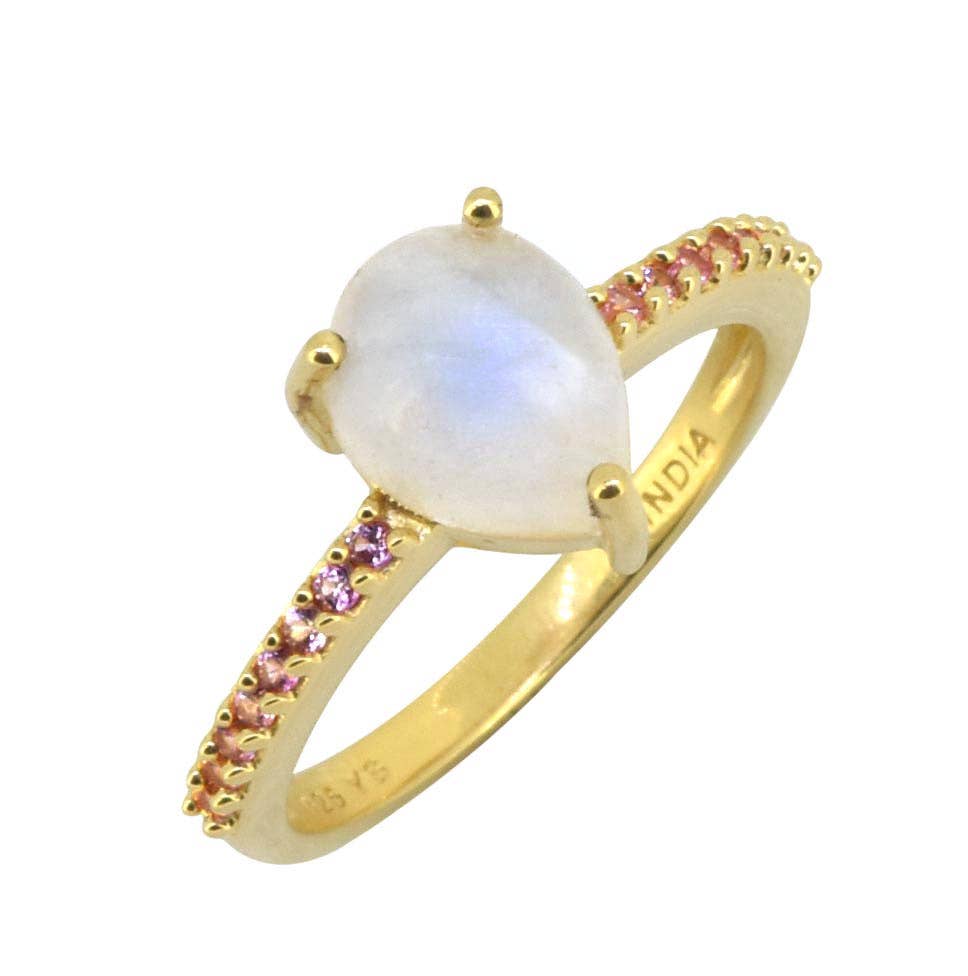The Petite Ava Moonstone Ring Set includes a genuine Rainbow Moonstone set on a pave, white topaz accented band, and an arched crown stacking ring. Ring Set includes two rings. Available in Rose Gold Vermeil & Sterling Silver. Gemstones: Genuine Rainbow Moonstone, White Topaz Rose Gold Vermeil: Thick layer of 18k Rose Gold over a sterling silver base. Sterling Silver: Rhodium over 925 Sterling Silver Center Stone: 5mm Available in whole sizes 5- 8. Standard US Ring Sizing. Hypoallergenic. Nickel & Lead free.