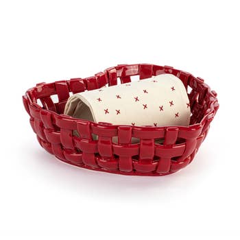 Whitewashed terracotta stone is incised with a nature-inspired design and sits within a handwoven kaisa grass basket with dyed palm wrap detail. Warmer is oven safe. A popular gift item! Due to the handmade nature, variation may occur. Dimensions: 3 1/2"h x 11"dia. Use and Care Instructions: Rinse before first use. Dry well. Preheat oven to 350 degrees F. Place terracotta stone in oven and bake for 10 minutes. Do not put basket in oven. Handling carefully, place stone in basket. For best results, wrap food in towel and place on warmer. To clean, rinse with water. Not dishwasher safe. Keywords: kitchen, dining, serveware, breadwarmer, warming stone
