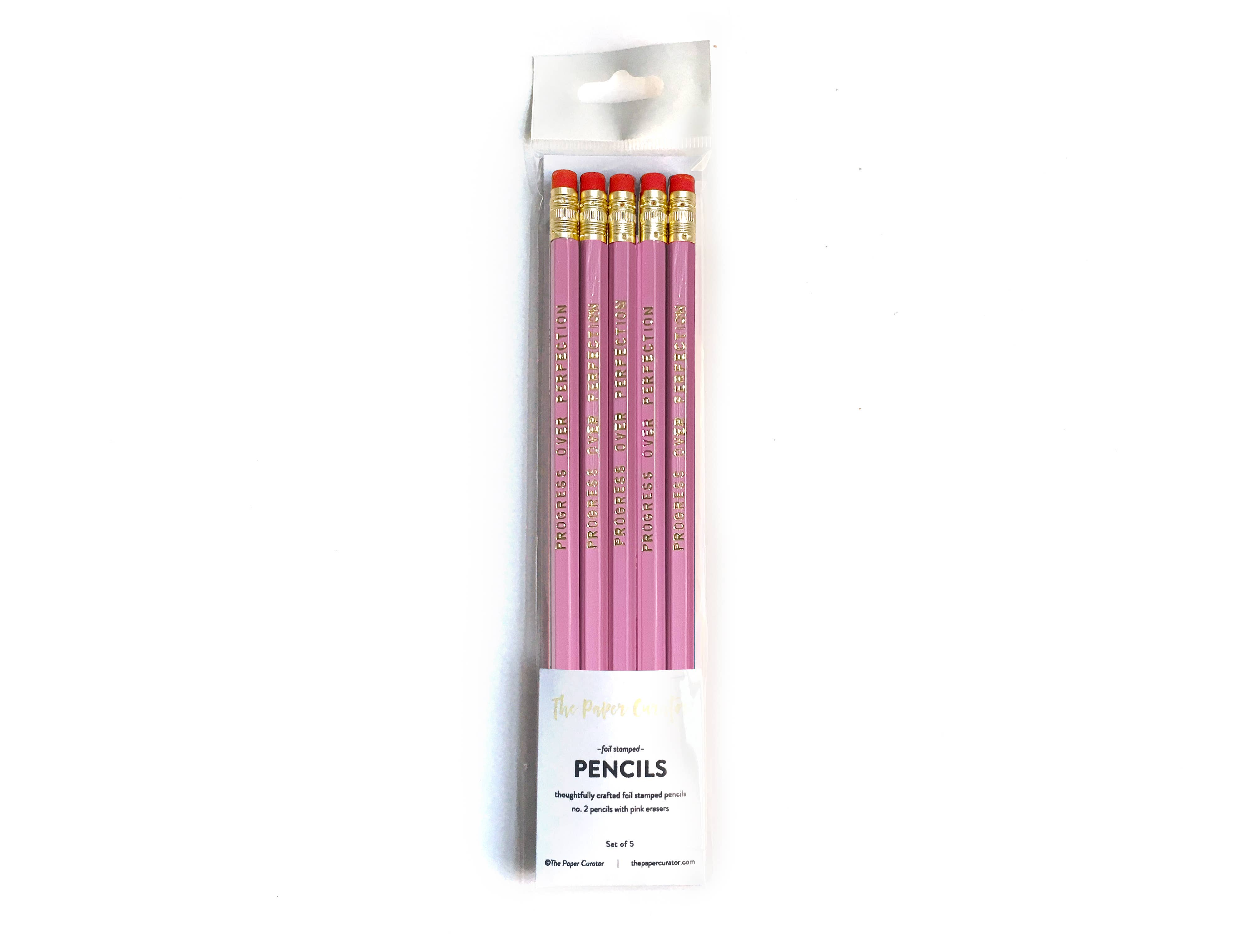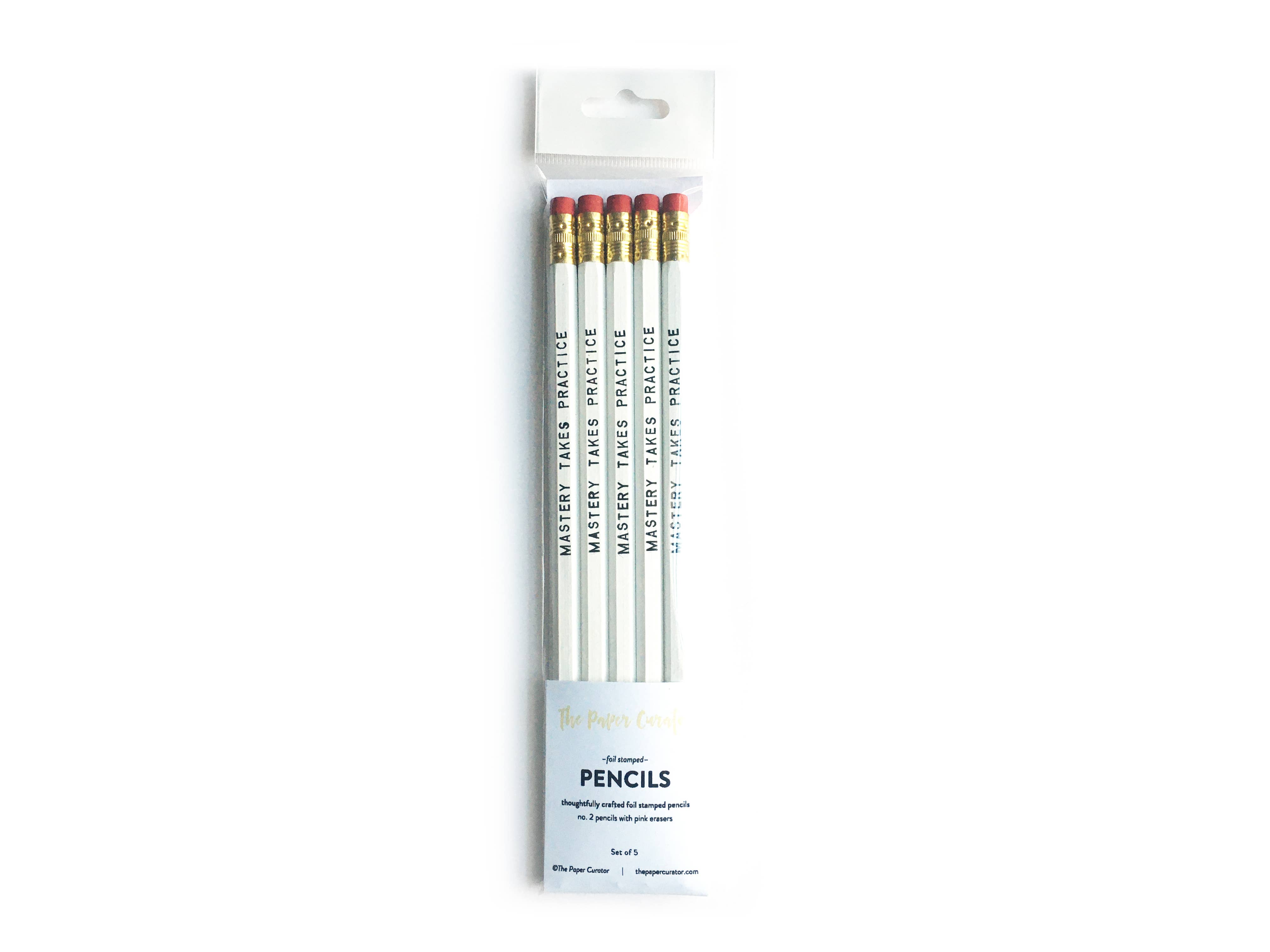 Our 'Mastery Takes Practice Pencil Set' features a set of (x5) hex no. 2 pencils in white color with black foil sentiment to remind those creatives and artists that mastery of any skill takes practice, so keep at it! Made in the USA. WHAT YOU GET // (5) White No. 2 Pencils with Black Foil Sentiment PACKAGING // Pencils come packaged in a cello sleeve with euro hook and a cardstock backer
