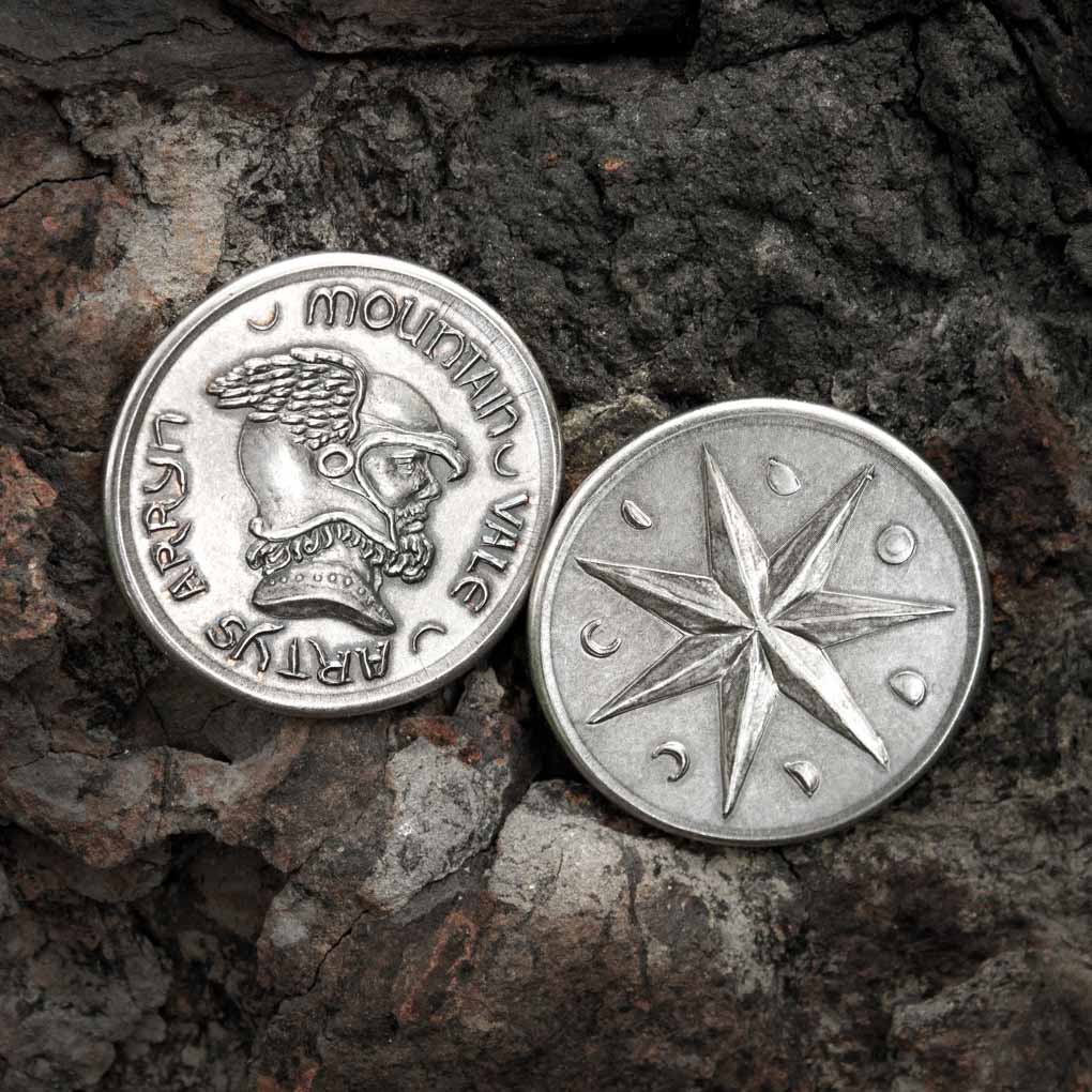Two Coins of the First Central Bank Includes: Copper Clip of Elendel Clips are thick copper coins and the smallest denomination. The coin features the Ascendant Warrior wearing a detailed Mistcloak and surrounded by the name of the city, “Elendel”, written in the Steel Alphabet. Golden Boxing of Elendel Boxings are large golden coins of Elendel. They feature the The Lord Mistborn overlooking the Elendel Basin surrounded by the words “Elendel” and “One Boxing”. On the reverse is the facade of the First Central Bank surrounded by the Steel Alphabet number 1. Coin artwork by Isaac Stewart, Ben McSweeney and Woody Maringer. Based on the Mistborn books by Brandon Sanderson, copyright Dragonsteel Entertainment, LLC.: Mistborn: The Final Empire © 2006, The Well of Ascension © 2006, The Hero of Ages © 2007, The Alloy of Law © 2011, Shadows of Self © 2015, and Bands of Mourning © 2016, www.brandonsanderson.com. **SAMPLE COINS HAVE HOLES**