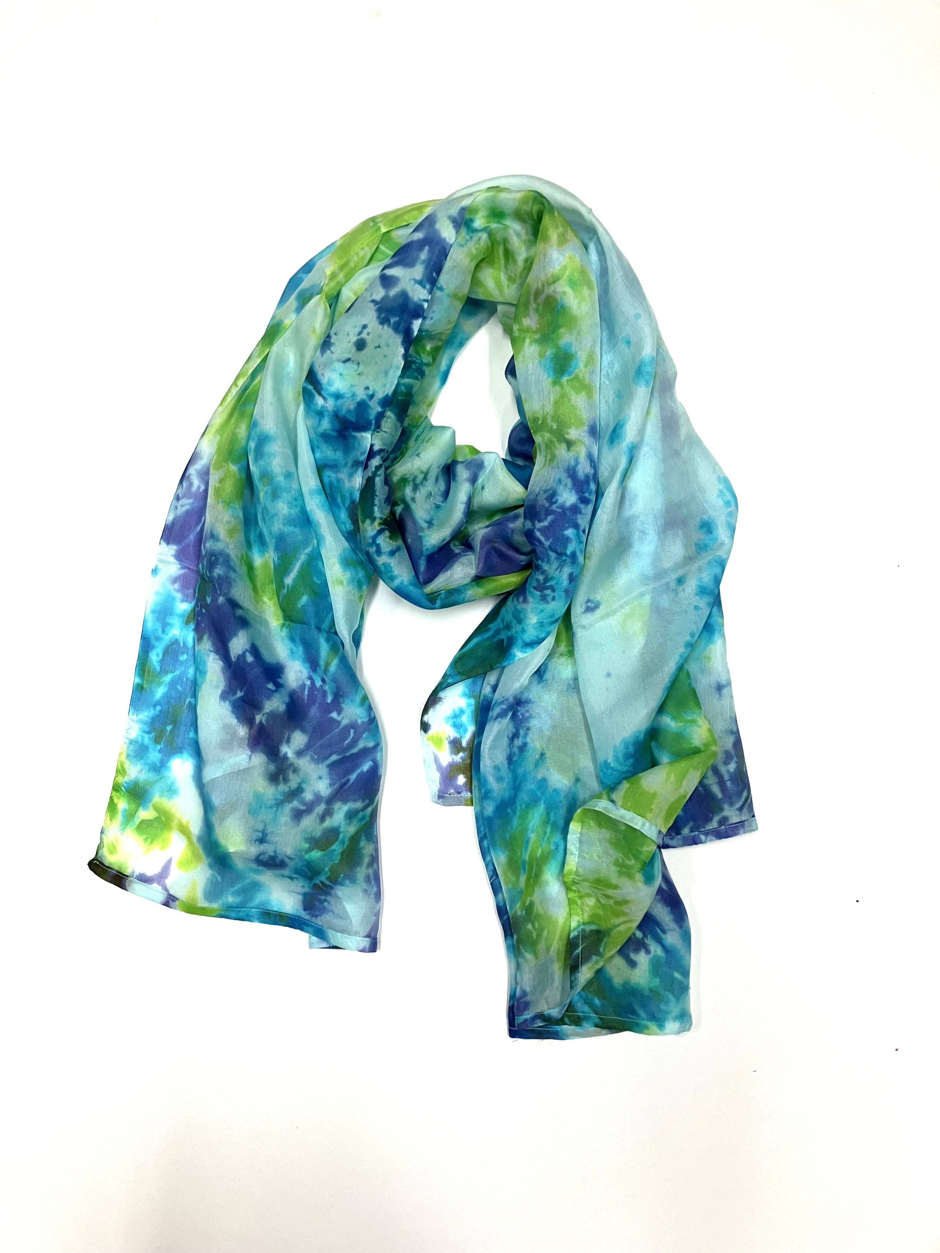 This soft, semi sheer silk scarf hand dyed in a dreamy light blue, with occasional speckles of darker blue scattered across the fabric. I dye each scarf to order, so my lead time may be as much as 3 weeks. Please contact me if you need your order sooner. - One For One - Each scarf plants a tree through our partnership with One Tree Planted. Thank you! - Made of hand dyed habotai silk. 11"x76" infinity.