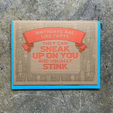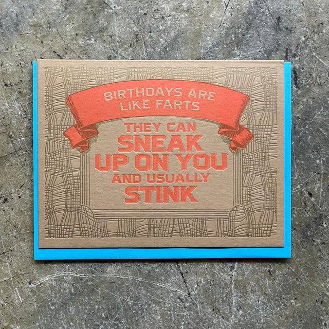 Funny Birthday card - Never trust a fart over 60 5.5" x 4.25" (A2) folded card. A2 100% recycled heavy kraft envelope. Professionally printed on 130# heavy cover stock. Blank inside for your own personal message. Heart shaped cut out on the front, revealing the gold heart sticker.