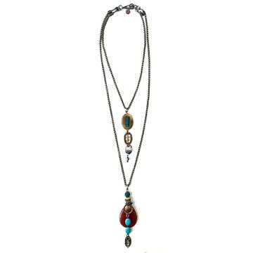 Seed beads, round hematite beads, coral, glass beads, signature graphics, antique gold color plated findings, chain, and lobster clasp. Adjustable length from 20" - 23".