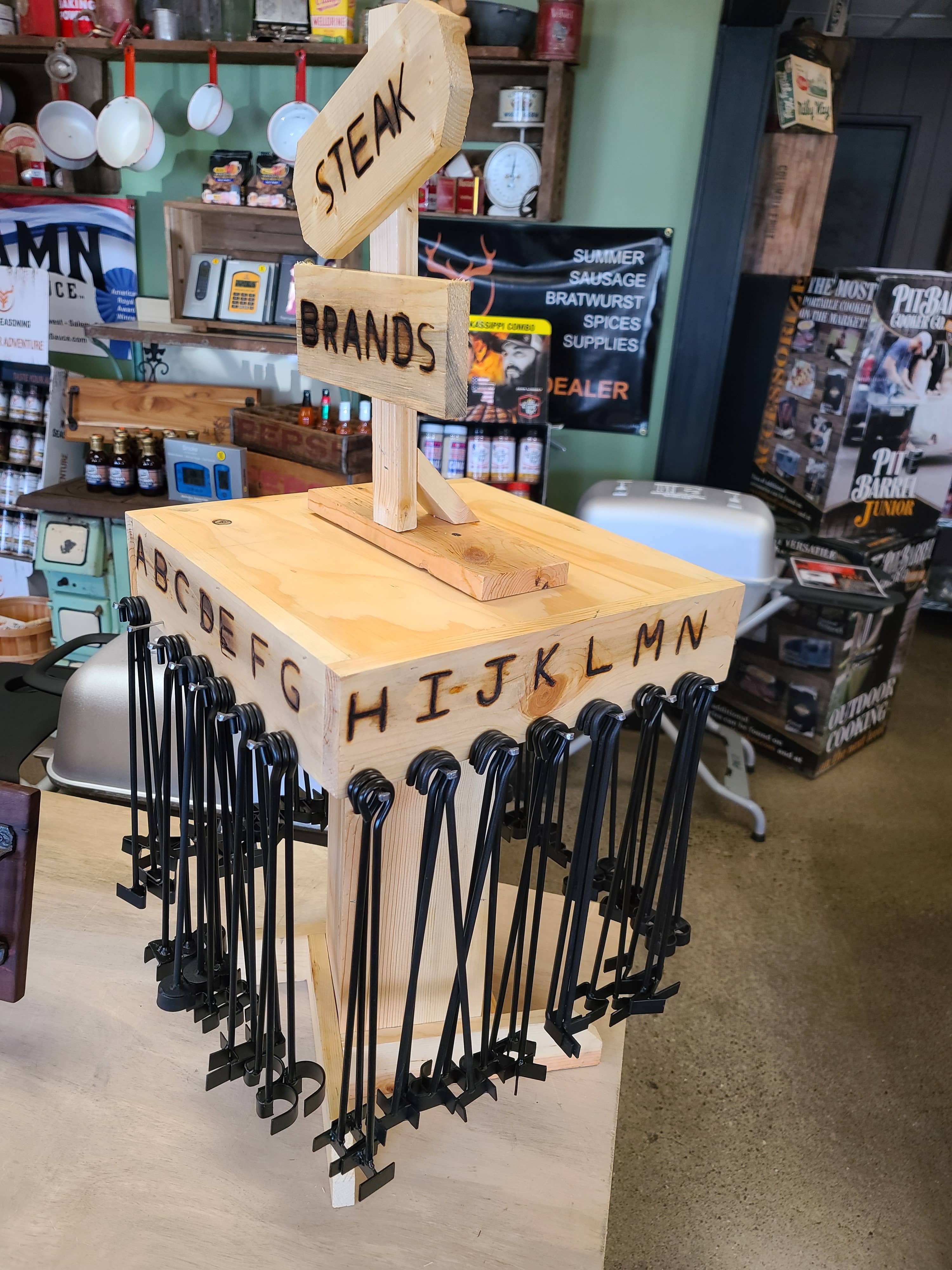 Steak Brand Starter Set 3 of every Letter A-Z Plus 3 Heart and 3 Star Including Display, Steak Brand Sign and Horseshoe Nails Steak Brands Are 12 inch long Letters are 1.5 INCH Individual letters are available for reorder at 4.95 Star and Heart are available for reorder at 4.95 each Display Measures 18"x18"x23" Topper not figured in height.