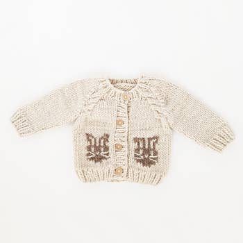 This hand-knit cream cardigan features a adventurous navy details with classic moss tree design. Our tree cardigan is hand-knit and designed to be the perfect addtion to your little ones' fall through winter wardrobe. Match this cardigan with our Navy Tree Hat. - Designed in Salt Lake City - Crafted with care using 100% hand-knit Acrylic. - Hand wash and lay flat to dry.