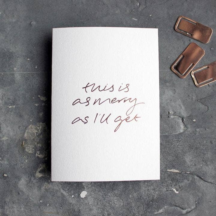 We all have that one friend who would appreciate us acknowledging their Christmas sentiments, don't we? Say no more and say it how it is with this card. Inside: Blank for your own message Colour: Rose Gold foil Size: A6 (148x105mm/4.1 x 5.8 inch) Weight: 360 gsm Paper: Fedrigoni is completely biodegradable and recyclable. Individually hand-printed using a traditional printing press. Foil blocked front and back. Matching envelope included.