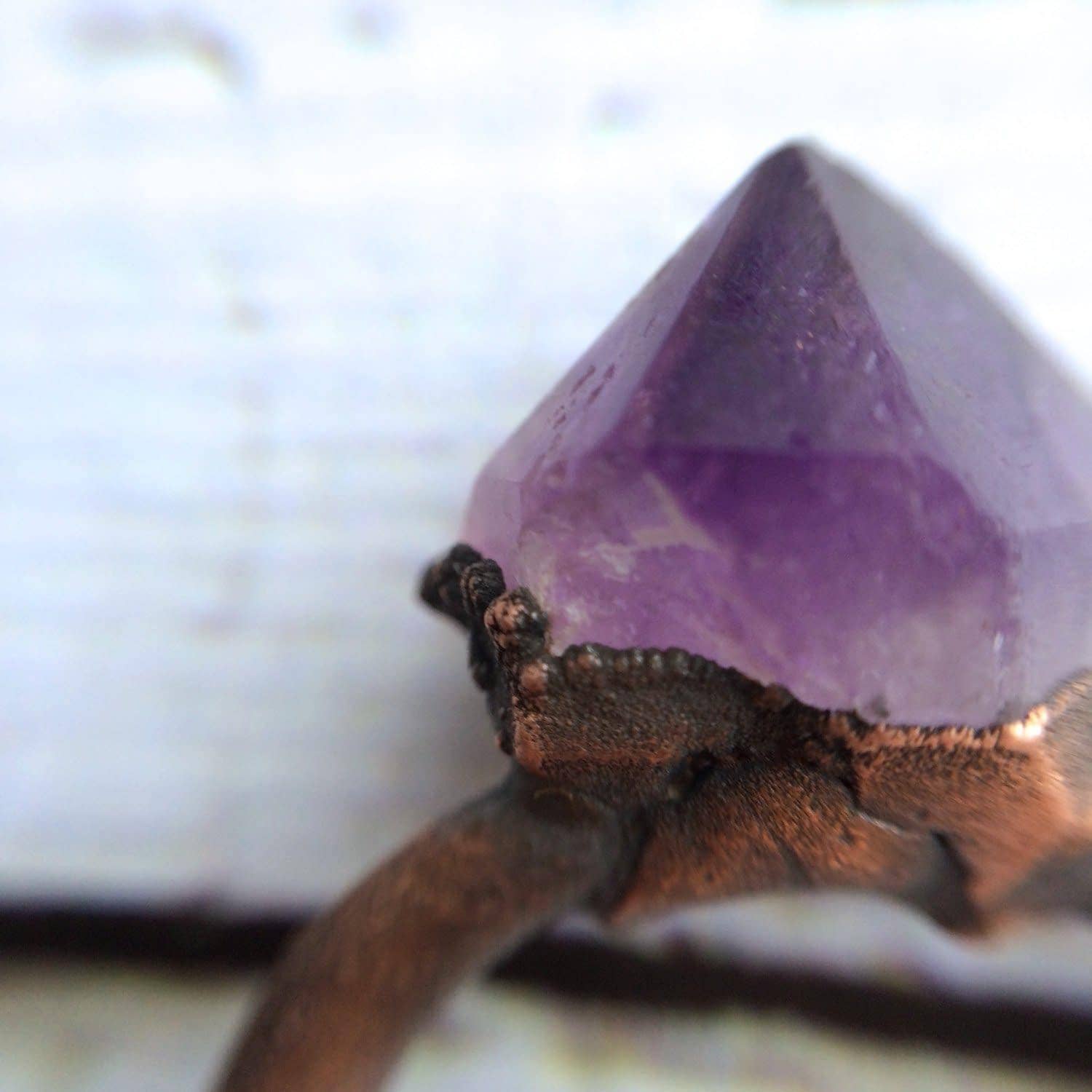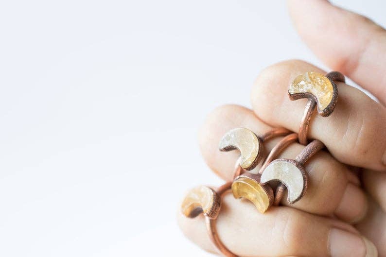 A raw kyanite crystal has been electroformed to a hand hammered copper band. Our jewelry is unique and one-of-a-kind. Please note there will likely be variances in the size, shape and color of each stone. All elements of your piece are handcrafted in our tiny studio on the island of Martha’s Vineyard. We sell our packaging! Find it here: https://www.faire.com/product/p_8os914jvdz