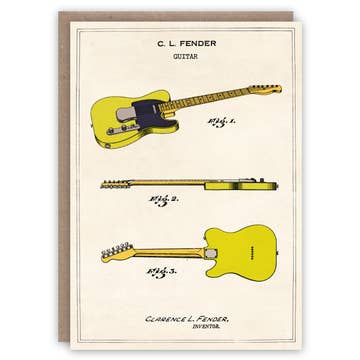 Adapted from US patent application filed in August 1951 for a solid-bodied electric guitar. The Fender Telecaster revolutionized guitar playing and helped shape the evolution of popular music. 170mm x 120mm (6 3/4" x 4 3/4"). Blank inside. Individually wrapped in a compostable bag with a 120gsm recycled kraft envelope. Printed with vegetable-based inks on a carbon neutral press using responsibly sourced, 300gsm Italian paper.