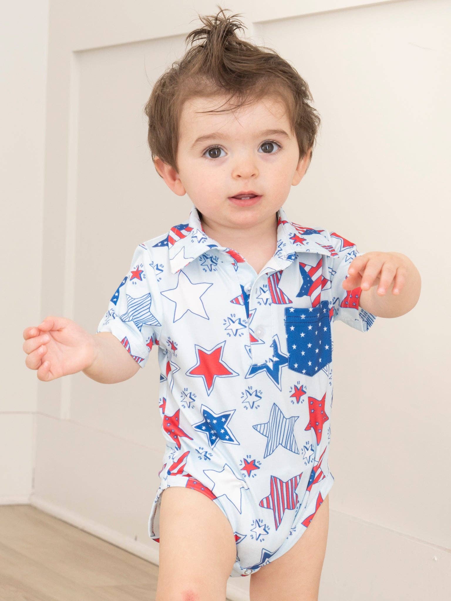 Get ready for some star-spangled fun with our boys button-up! Complete with a button up and collar design, this patriotic piece showcases a playful print of American Flag stars, perfect for any brother set. From Marie Nicole Clothing. * Fits true to size. * 95% Polyester / 5% Spandex * Accessories sold separately. * Import. .