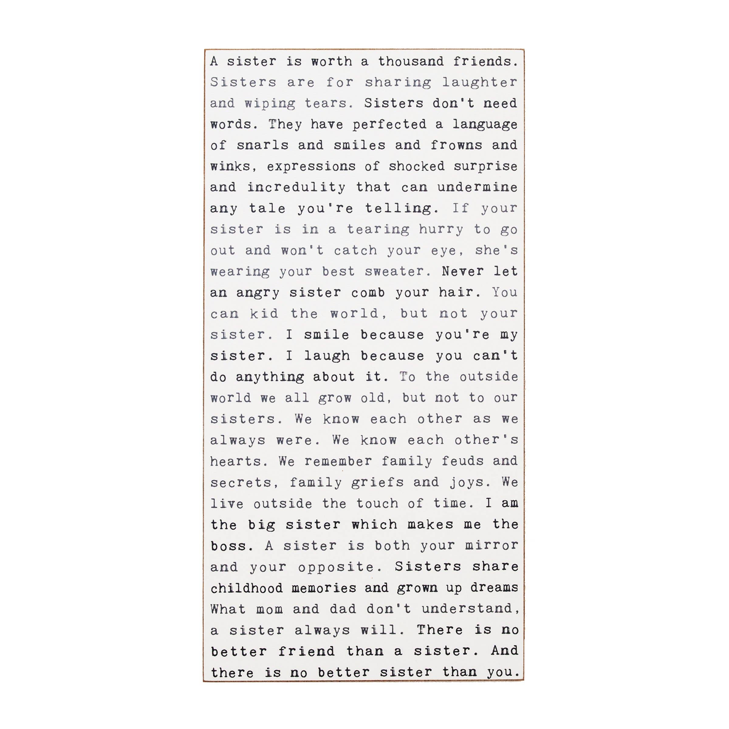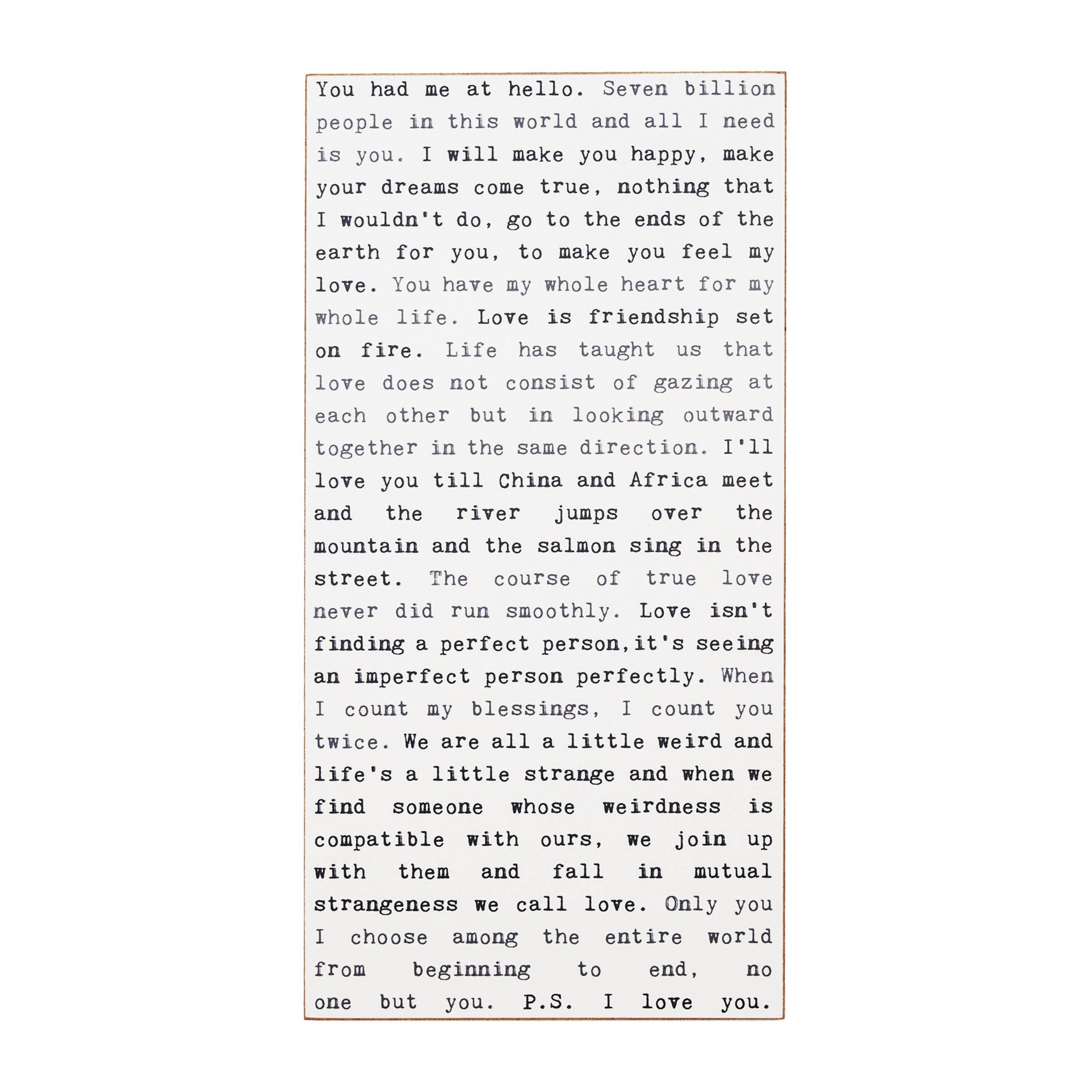 Typewriter signs are reminiscent of a time when people manually typed letters to their loved ones on a single sheet of airmail paper that folded into an envelope. Postage was dear so paragraphs were ignored and words were crammed to fit. • Dimensions: 8" x 16" x 1/2" • White background with black and grey lettering • Individually gift boxed • Printed on wood composite • Keyholed for easy hanging • Minimum order is 2 per style