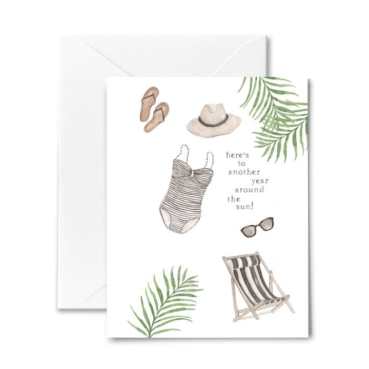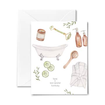 Celerbate a birthday in the most relaxing way! Featuring an array of spa accessories, this card will instantly send those self-care vibes. size: A2 (4.25x5.5) blank inside printed on white linen stock includes white envelope packed in a clear cello bag original watercolor artwork from Me and Mary