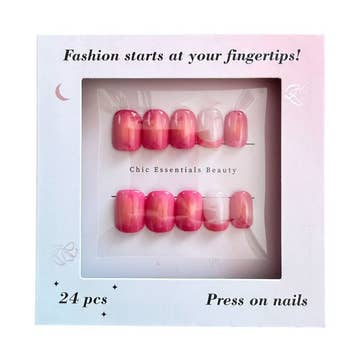 The ideal wholesale bundle for retailers looking to expand their press-on nail offerings. This Starter Bundle features 13 top-performing nail styles and a press-on nail remover, giving customers a complete solution for easy application and removal. What’s Included? Press-On Nail Styles (4 units per style) – A diverse mix of bestsellers: Moonlight, Pure Intentions, Honey Bun, Mirror Mirror, Rosé, Pink Macaron, Silver Belle, Baby Blues, Fairy Dust, Paris, Berry Maroon, Hot Pink, and Fiery Red. Press-On Nail Remover (6 units) – A gentle yet effective formula designed to dissolve adhesive without damaging natural nails. Why Stock This Bundle? * Retail-Ready Assortment – A curated mix of neutral, bold, and trending shades to attract diverse customers. * High-Margin, High-Turnover – Press-on nails are a fast-growing category with strong repeat purchases. * Convenient Restocking – Contains multiple units per style, ensuring a well-stocked display